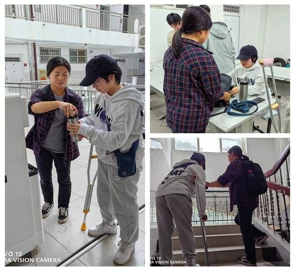 2023年10月13日以来,罗灿同学因打球腿部受伤行走不便,她每天从宿舍到教室上课放学,都是东一栋宿管员龚华丽和另一名宿管员梁冬艳负责接送。罗灿同学上课要用电脑,宿管员每天背着电脑,搀扶着她走进教室,下课后又接送她回到宿舍。罗灿同学在受伤期间去医院复查,宿管员龚华丽主动帮学生叫车,细心搀扶她下楼到路边等车,她无微不至照顾受伤的学生,帮学生打开水递到学生手上喝药。