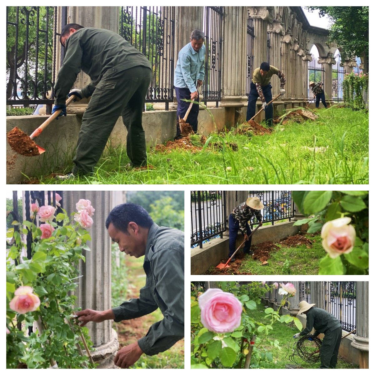 现在正是月季的盛放期,大家都知道,今年的月季已经爆红武汉,公园里、马路上、街道边,小巷里,都能看到美丽的月季花墙。环艺师傅们一边栽种,一边说到:“明年我们学校的月季会更好看”!在这里我们也呼吁同学们,爱护花草树木,不要在铁栅栏上挂外卖,损坏花木的生长。相信在园丁们的精心养护下,待到来年开春时,武昌理工将成为校园月季花墙又一个网红打卡地!让我们一起憧憬吧!