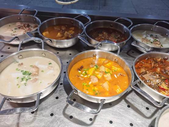 走进桂园食堂二楼,一股浓郁鲜香的热气扑面而来,与窗外的清冷形成鲜明对比。取餐窗口处,保温台上摆放的小锅火锅分外醒目。仔细看去,品种丰富:酸菜鱼锅酸爽开胃,鱼片嫩滑;排骨锅酱香浓郁,肉质酥软;鱼头豆腐汤色乳白,鲜美醇厚;牛腩锅软烂入味,香气四溢;更有颇具地方风味的腊鸭焖藕,咸香与清甜完美融合;此外,鸡子、鸭子等各式火锅也一应俱全,满足不同口味需求。