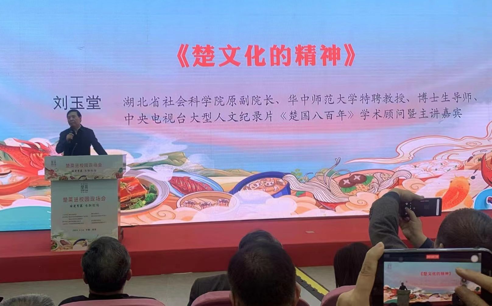 接着由省社科院原院长、博士生导师、中央电视台人文记录片《楚文化八百年》的学术顾问刘玉堂先生,为大家讲述“楚文化的精神”。他说楚文化历史悠久,楚人特别能吃苦耐劳、负重前行,“筚路蓝缕”就源自于楚国,楚人不怕苦、“不服周”、性格坚强,在风云迭起的春秋战国时期就曾一度傲视群雄、称霸一方。历史一路走来,楚菜文化不断发展、不断升华,现如今早已扬名海外。楚菜是楚人智慧的结晶,他来源于生活,来源于几百年历史的沉淀与积累,大家一定要继承和发扬楚菜,共同传承楚菜文化。