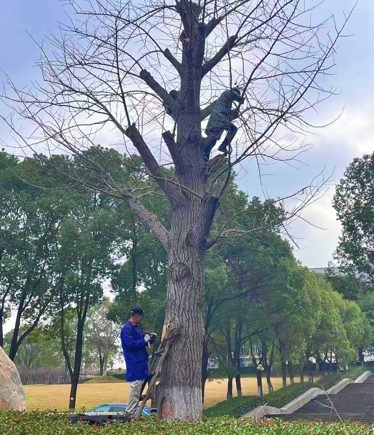 近日,环艺部员工正在养护古银杏,这棵古银杏树高约10米,直径约1米,是我校树龄最高的一棵银杏树。