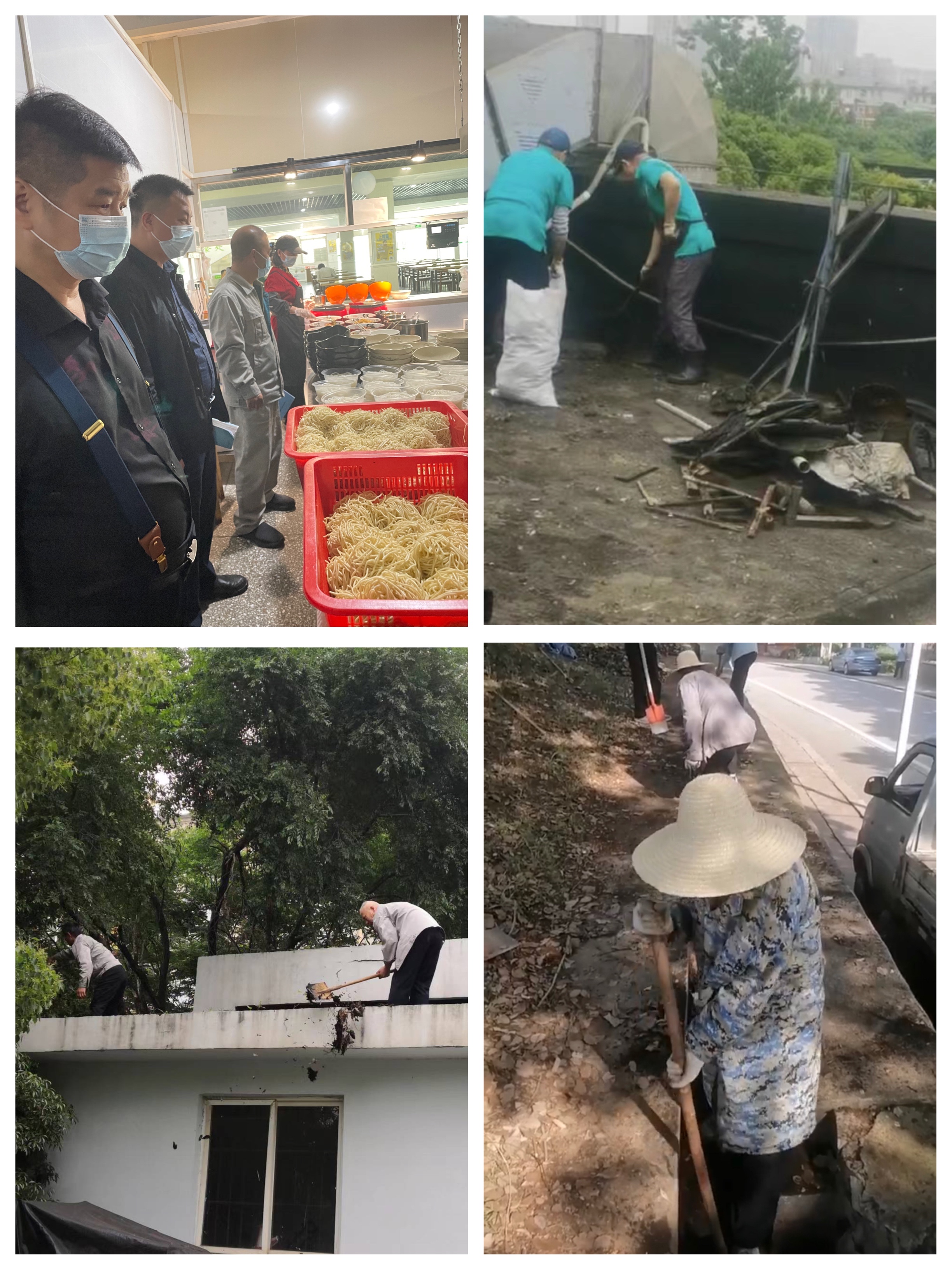 从5月12日至18日,环艺部从梅南山周边开始,沿信工—文法—商院—白果园,清理地沟、泥沙清理与疏通;各食堂、教学楼、宿舍楼楼顶与平台及周边,各管辖部门积极清理,将杂物、砖块清理下楼,做到排水口通畅无杂物;水电部对公共区域的地沟、排水口进行了清理;保洁部对校内树叶、白色垃圾、死角卫生进行了全面清理。