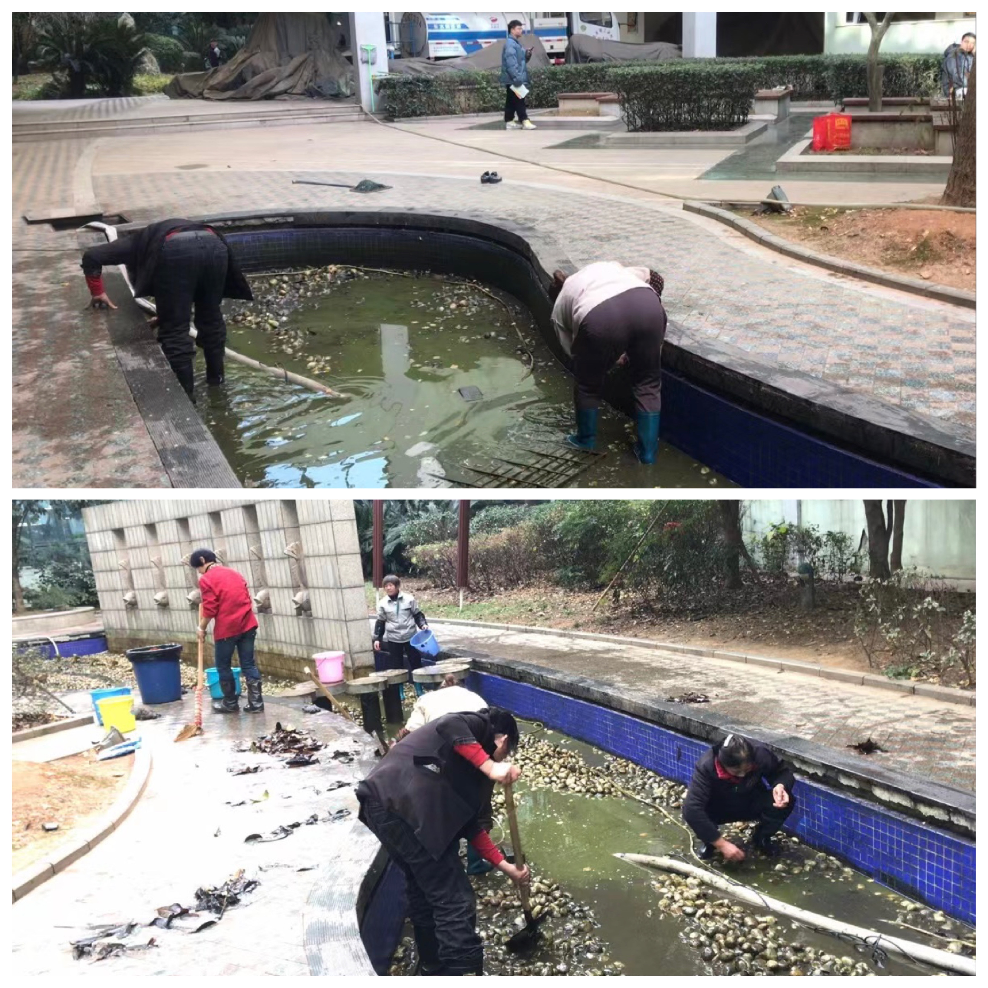 我们保洁师傅们没有被眼前的困难吓倒,他们充分发扬了不怕苦、不怕累、不怕脏的工作精神,排除困难,不俱寒冷的天气,挽起袖子就下水,有的捡鱼池里的树叶、有的洗鱼池墙裙,有的翻鱼池的石头,有的提鱼池的水。经过他们的分工协作,相互配合,用了一个下午的时间顺利完成此次鱼池清洗任务。(通讯员 张琴娥)