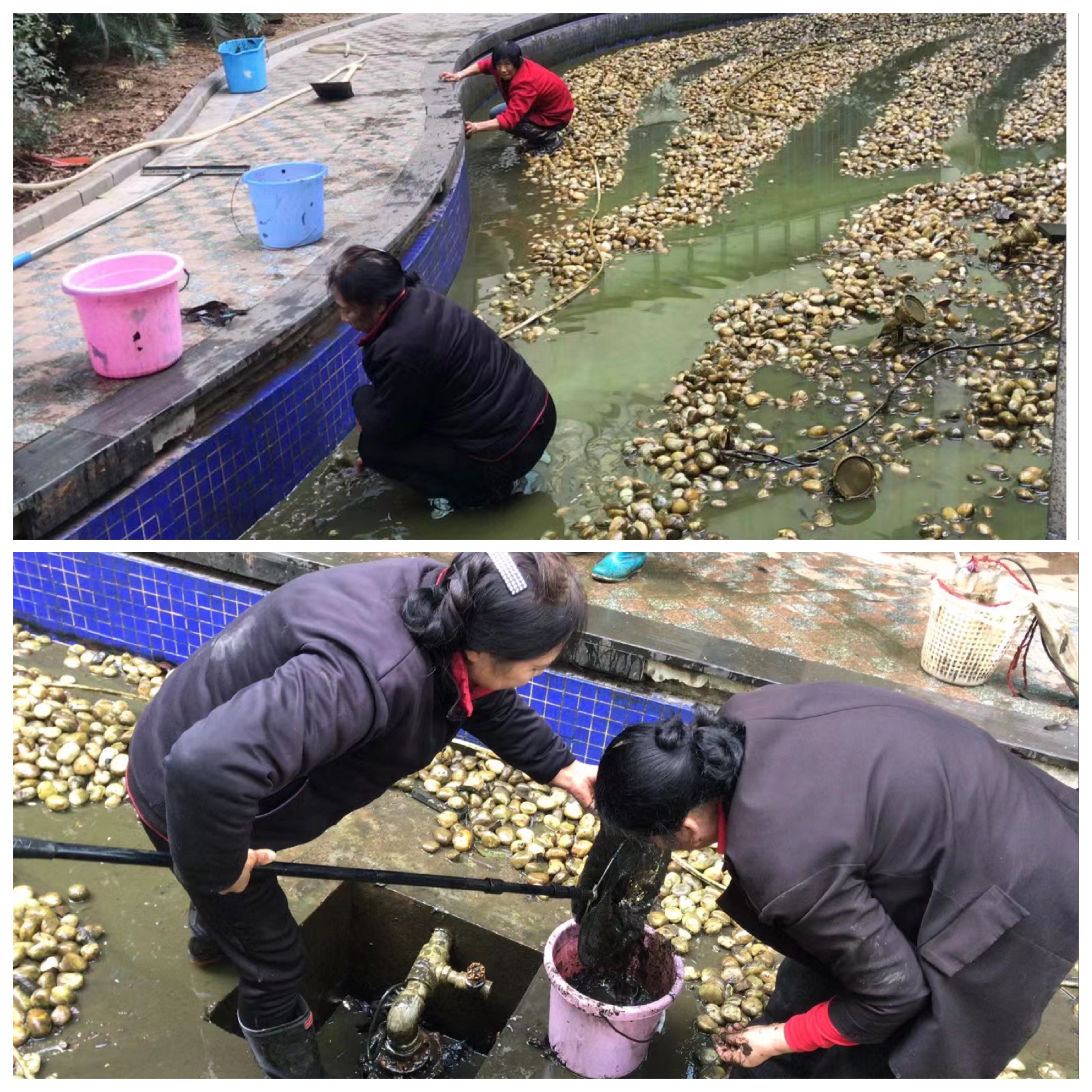 图书馆鱼池清洗有很大难度,一是鱼池底下有一层大大小小的鹅卵石;二是鱼池没有可以排水的地方;三是鱼池里有鱼需要打捞。这给清洗带来很大难度。要想彻底清洗干净,必须先把鱼池的水抽干、打捞鱼后再把鱼池下面的一层鹅鹅卵石翻开进行冲洗,而且每冲洗一遍还要将清洗的污水舀干净,才能进行第二遍冲洗。如此需要反复清洗四遍以上才能将鱼池彻底清洗干净。