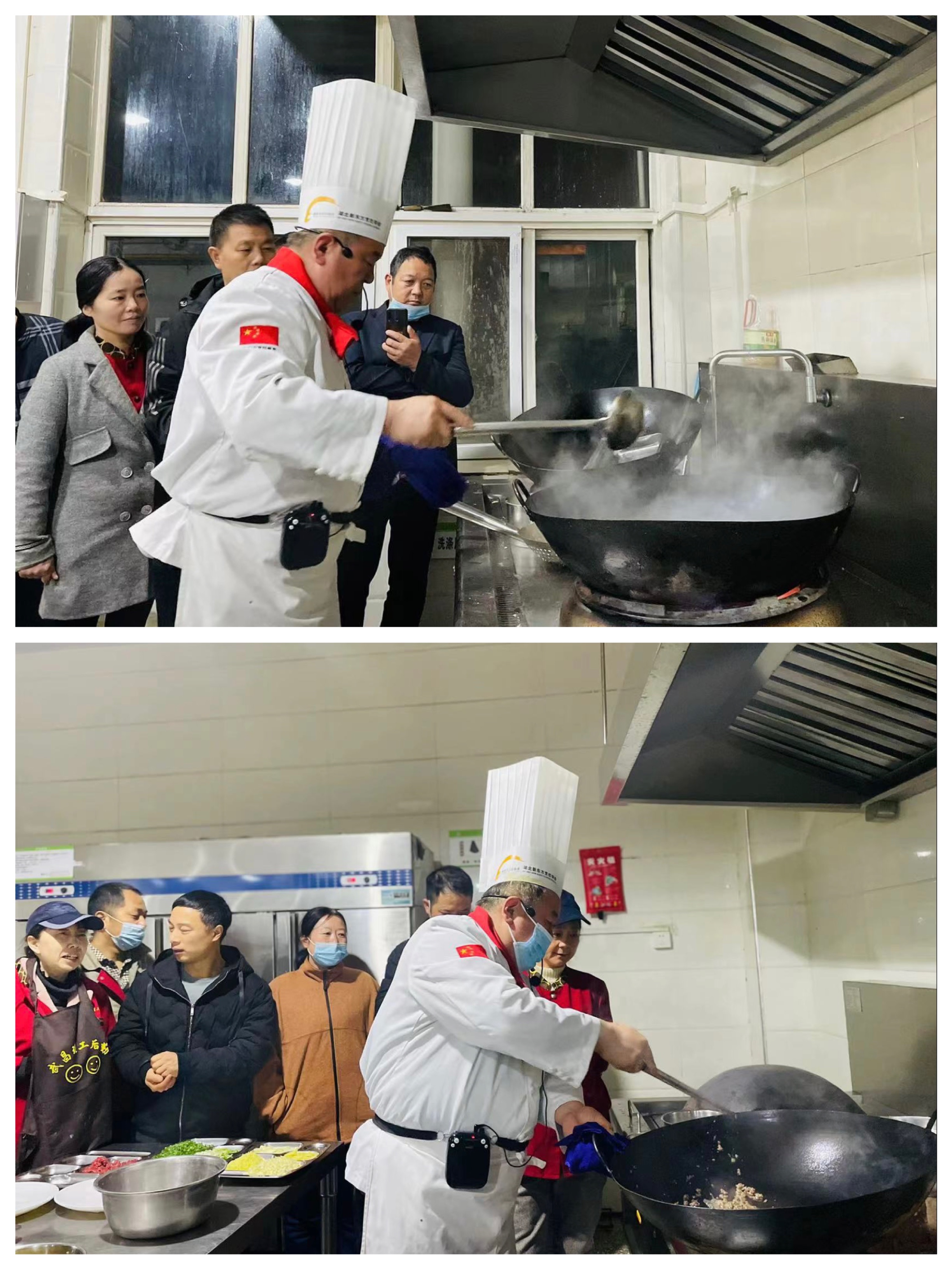 本次培训先由饮食部黄经理讲解菜品配色的技巧及菜品配比的要求,后由张涛大师进行系统性的培训,先理论后实际操作。他对每一个问题和环节都进行详细的板书,从菜品选料、制作要点、出品特色、调料使用、上浆与挂糊、煎炒烹炸技巧等进行了系统的讲解。然后大师又亲自操刀,从切配到烹饪成菜,一步步精细操作详细讲解,其间迎来大家的阵阵掌声、惊叹声。尤其是张涛大师优美的颠勺功夫和精细的调味给料眼神,将课堂气氛推至高潮。现场出品的三道菜,“麻婆豆腐”、“酸菜鱼”、“农家小炒肉”,在“色、香、味、型”上得到了大家的一致夸赞,师傅们表示受益匪浅。
