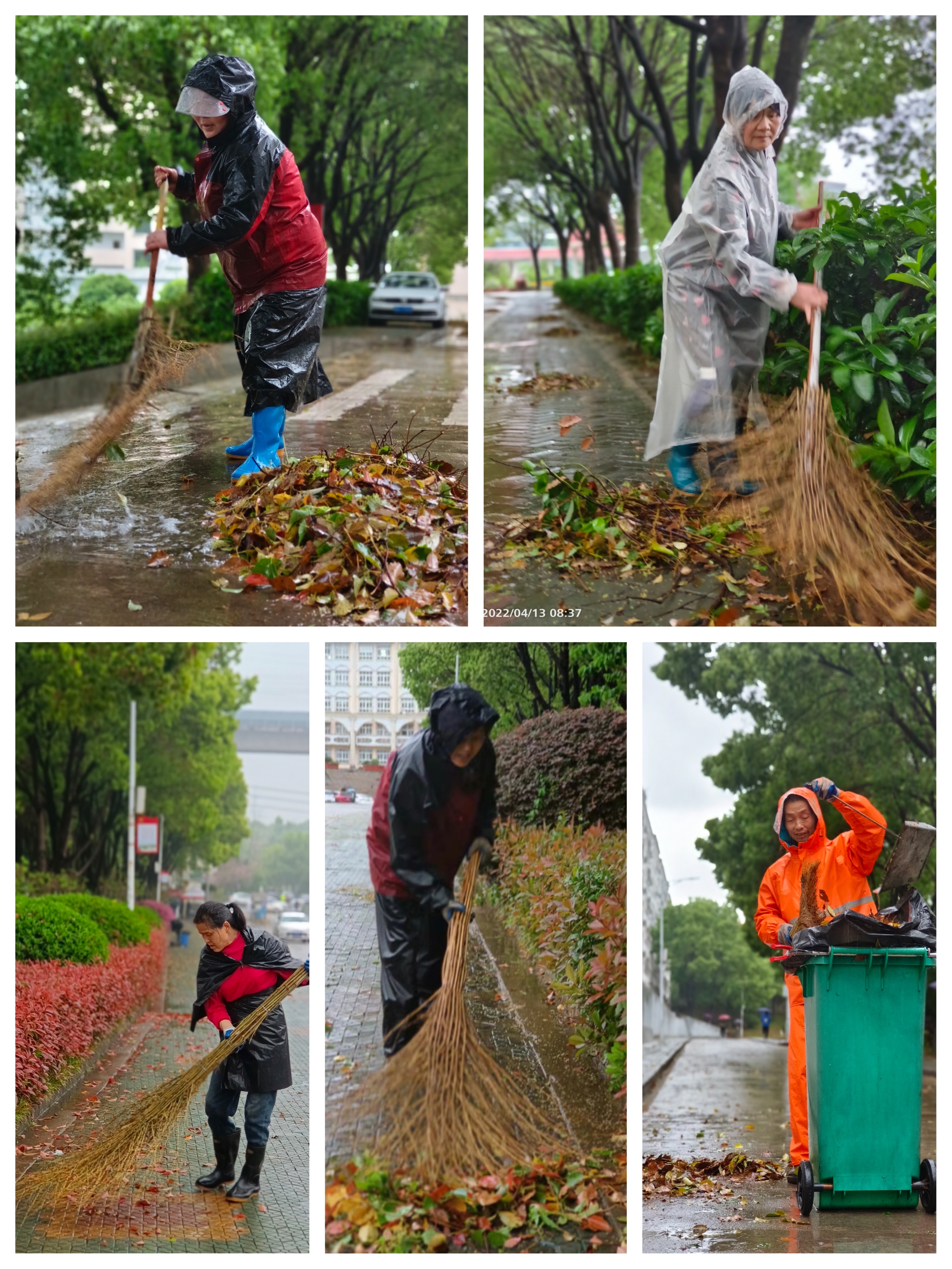 每年的三、四月份,武汉由冬向春换季,也是天气最爱刮风下雨的季节。“春风吹十里,落叶满校园”,当大家看到树叶在风中翩翩起舞时,都不禁赞叹:“哇!太美了”。而在这美景的背后,却是我们保洁师傅们在风雨中不畏艰辛,清扫树叶的身影。当拂晓清晨我们还在休息时,有这么一群人正默默地迎风冒雨赶赴工作岗位,对各自区域路段进行清扫,上演着风在吹、叶在飞、人在追的场景,他们就是我们后勤可敬可爱的保洁员们。4月12日夜里的一场狂风暴雨,吹的路面上到处都是树枝、树叶、白色垃圾,给外围保洁员的清扫工作带来了很大难度,但是她们面对狂风暴雨和一片狼藉的路面,依然冒着大风大雨打扫吹落的树枝、树叶,收集师生们丢弃的生活垃圾。雨不停打落在她们的脸上,淋湿了他们的衣服,他们却丝毫没有退缩躲雨的想法,而是不停地向前挥动着手中的扫帚,只看到他们埋头苦干的身影,只听见他们哗啦哗啦清扫树叶的声音。当遇到一些垃圾牢牢粘贴在地面上、落在角落缝隙和排水孔里扫不出来时,他们从不怕脏,用手清掏出来。