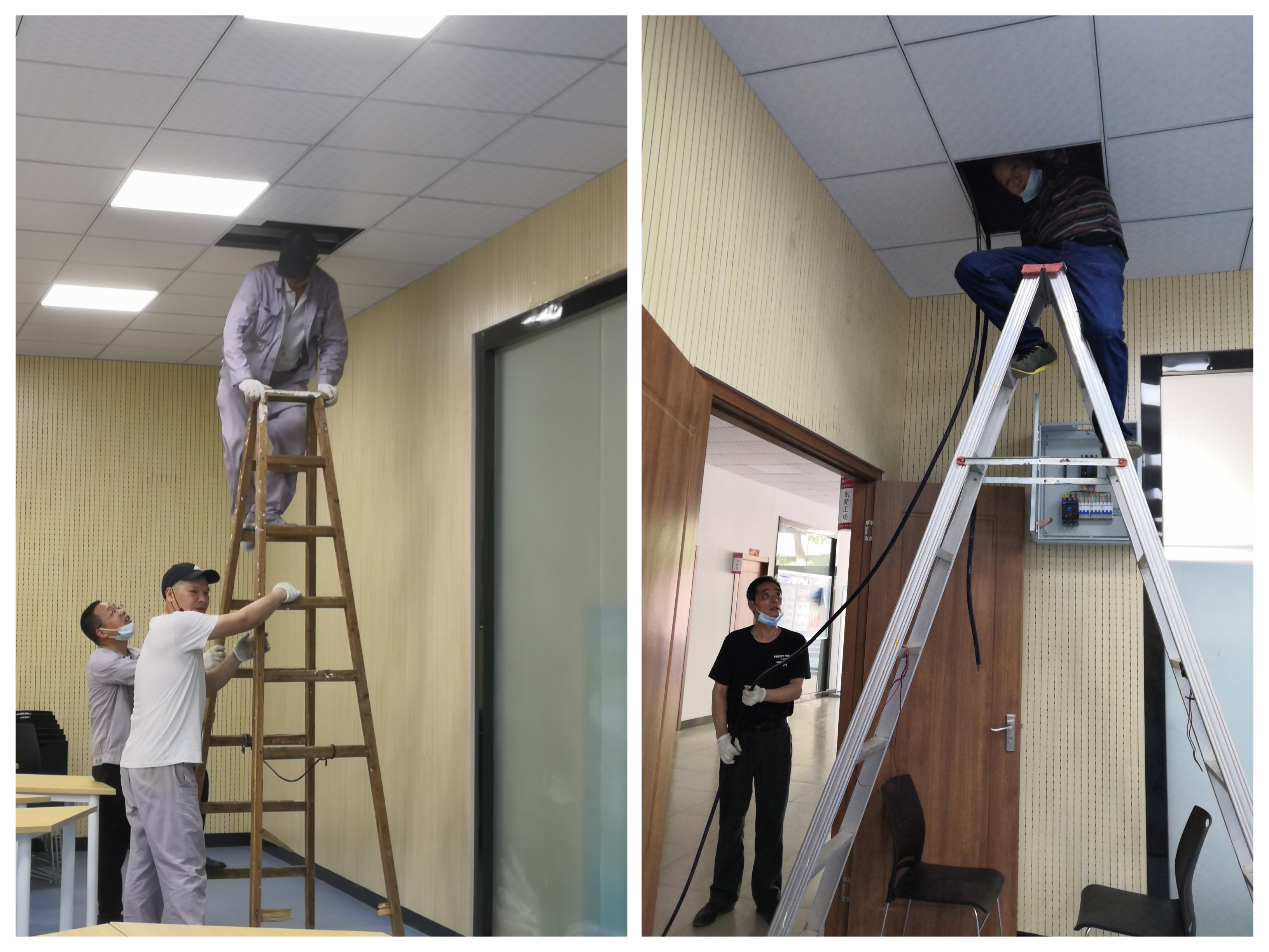 采购部门将所有材料采购到位后,水电部立即组织人员施工。施工当天,正值气温大幅回升,室外温度达到31度,施工现场异常闷热。大家挥汗如雨,一部分师傅负责安装配电箱,一部分师傅爬到到3米多高的架梯上,揭开吊顶扣板,将60余米电缆按设计路径铺设到位。做电缆头、压线鼻、还原吊顶,经过近4个小时的奋战,终于将主电源安装到位。