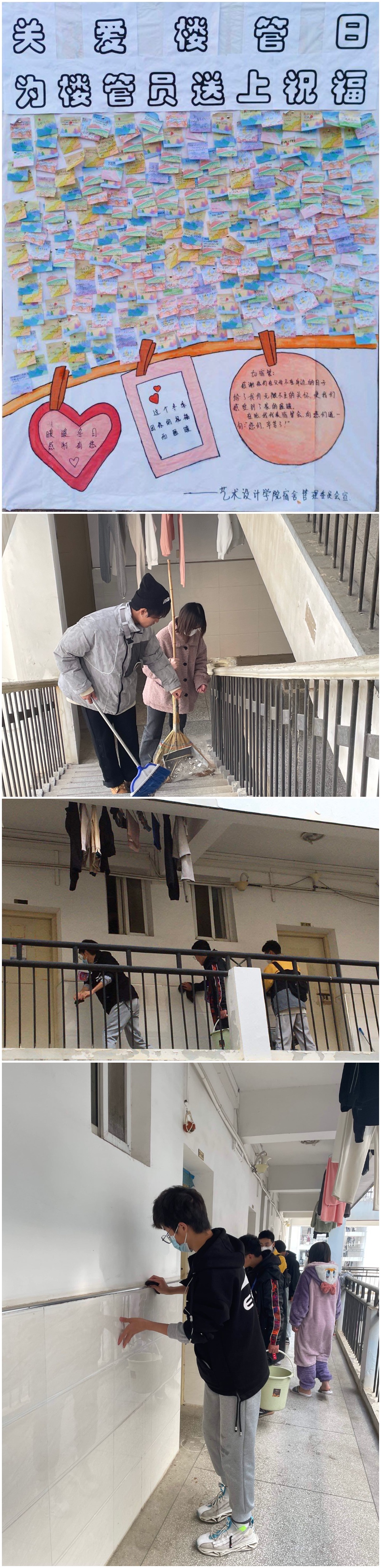 参与此次活动的有宿管会全体成员以及艺术设计学院的学生志愿者。在活动过程中同学们互相配合着打扫楼栋卫生。在打扫卫生的过程中发扬着不怕脏,不怕累的精神,为楼栋卫生的打扫尽自己最大的努力。在分配好各自负责的区域后,同学们不敢有一丝懈怠,有的同学在扫地、有的同学在擦墙,都在努力认真的打扫着自己所负责区域。本次活动除了对楼栋的卫生打扫外还有为各位楼管员们送上冬日的祝福。在打扫完卫生后,将同学们对楼管员表达的感恩贺卡送到各位楼管员的手中并同时为他们送去拖鞋、暖宝宝等物品。为表达对楼管员们辛勤工作的感恩,活动最后参与此次活动的全体成员于东七寝室楼门口合影留念。在同学们的积极参与下,本次关爱楼管日活动取得了圆满的成功,展现出同学们良好精神面貌,同时也增进了艺术设计学院宿管会与宿管员之间的沟通与交流。为宿管会的建设打下了良好的基础,并增强宿管会之间的凝聚力。