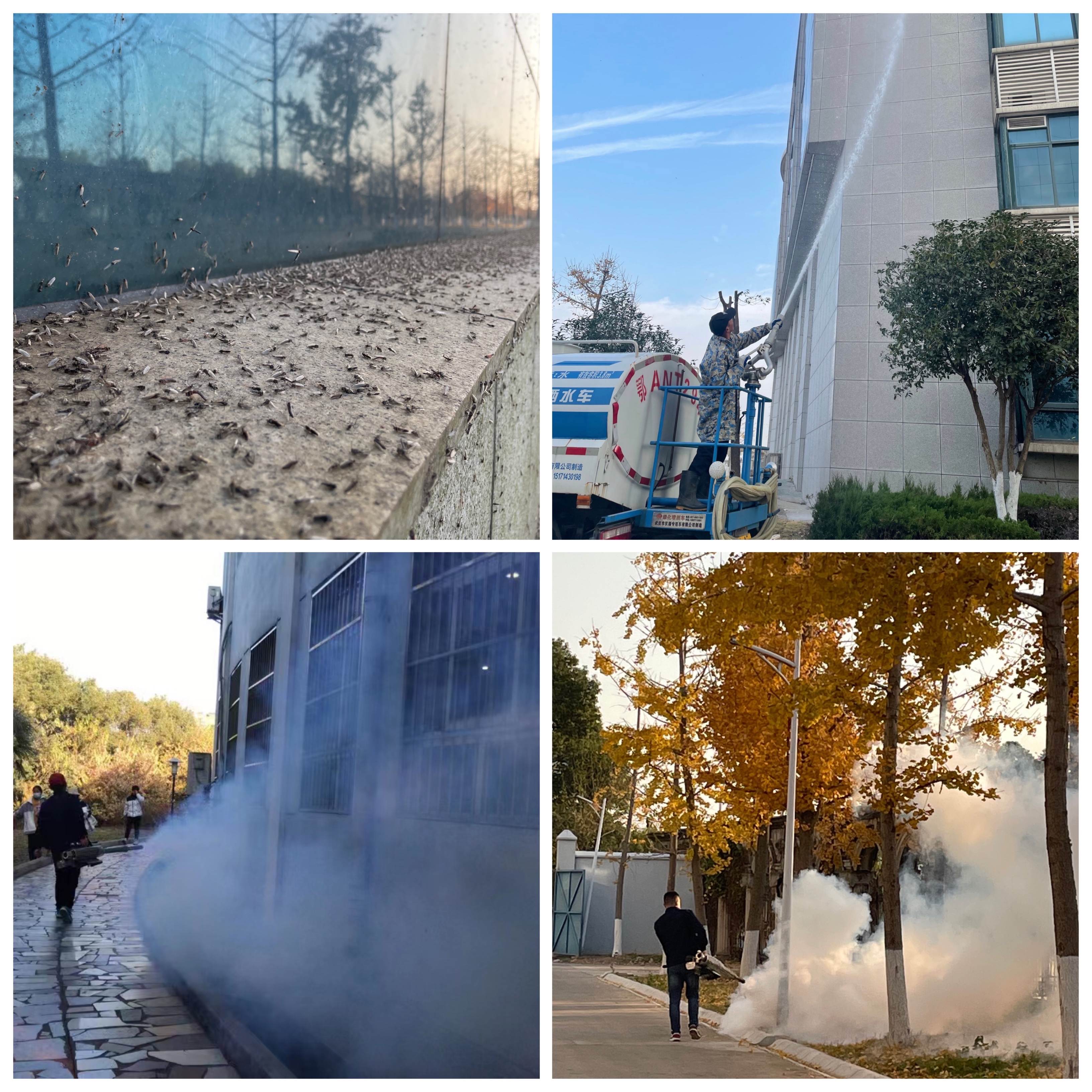 学校领导和后勤服务中心十分重视,从11月中旬开始,新购置高压水枪、电动喷雾器等专业消杀工具。在每天清晨和傍晚摇蚊活动最多的时候用高压水枪喷射外墙、各楼栋局部药物喷杀、分区包干清扫,但效果不明显。