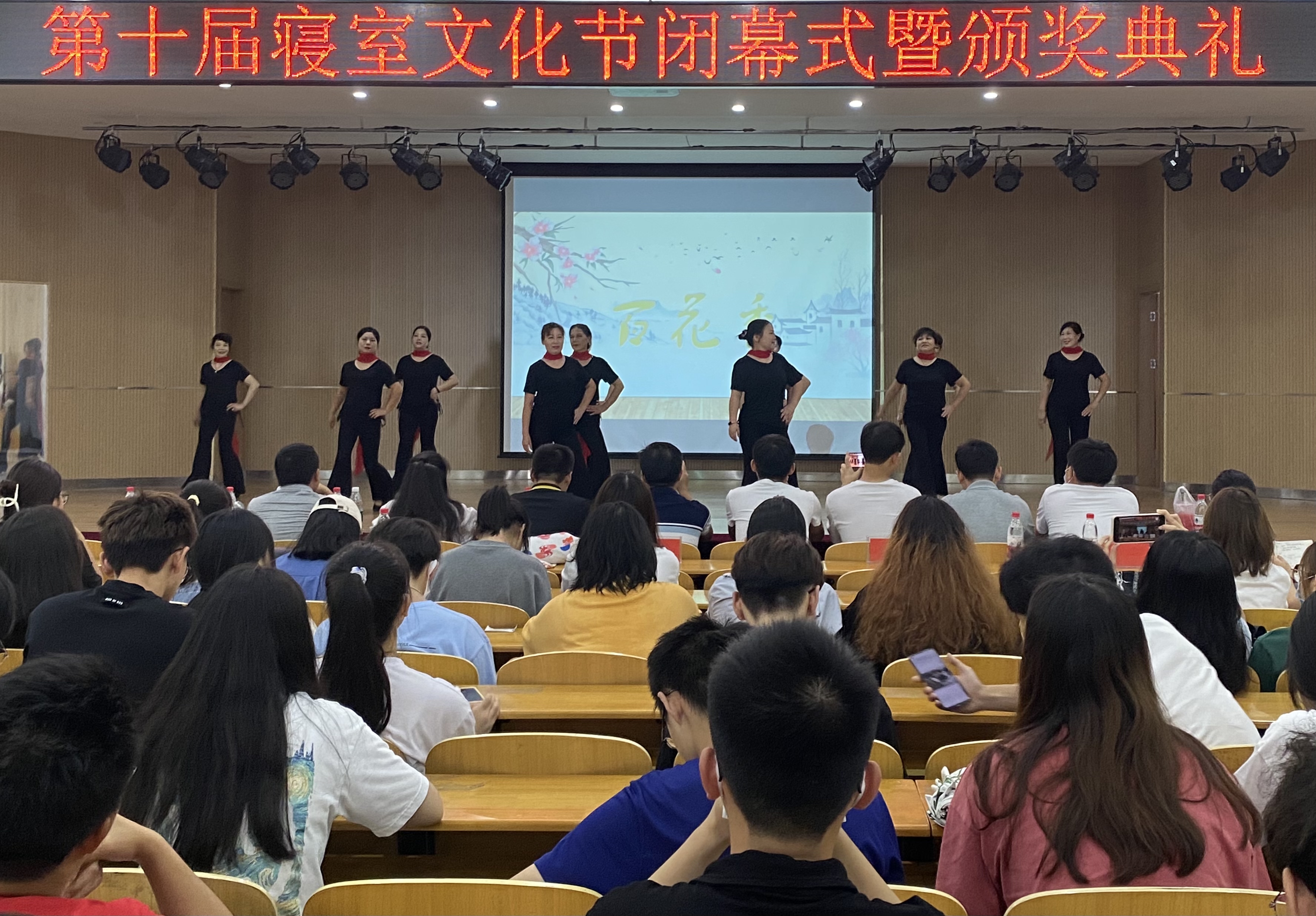 2021年6月18日中午12点20分,在商学院9楼学术报告厅,同学们期盼已久的武昌理工学院第十届寝室文化节闭幕式暨颁奖晚会正式拉开了序幕。当主持人报幕:“下面由武昌理工学院宿管员给各位领导、老师、同学们带来舞蹈《百花香》”,宿管员们精神抖擞、神采奕奕,身着统一的舞蹈服、系着飘逸的红丝巾、踏着自信从容的步伐走上舞台时,台下顿时掌声雷动,欢呼声响起。