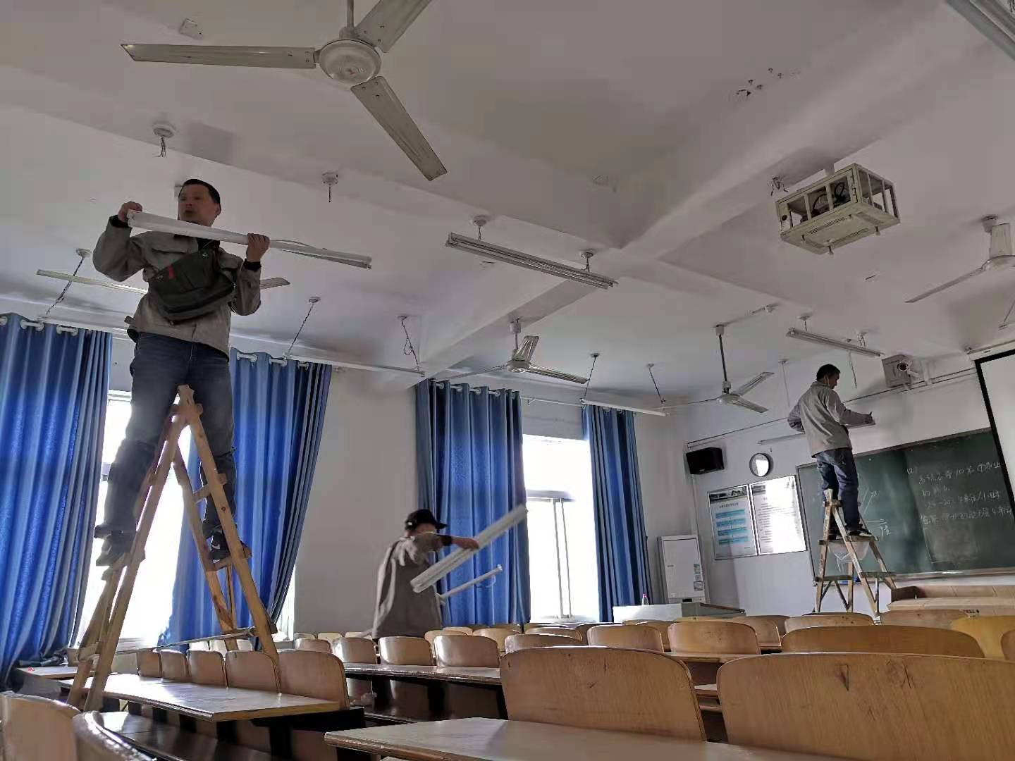此次商学院的灯具改造,涉及到三、四、六楼所有教室及教师休息室,需拆下原有旧灯具,更换成新光源。为了降低维修成本及旧物使用,水电师傅们要把拆下的旧灯具逐个鉴别,除去报废灯具外,要把可以使用的旧灯具保留,以供日后其它地方维修使用。