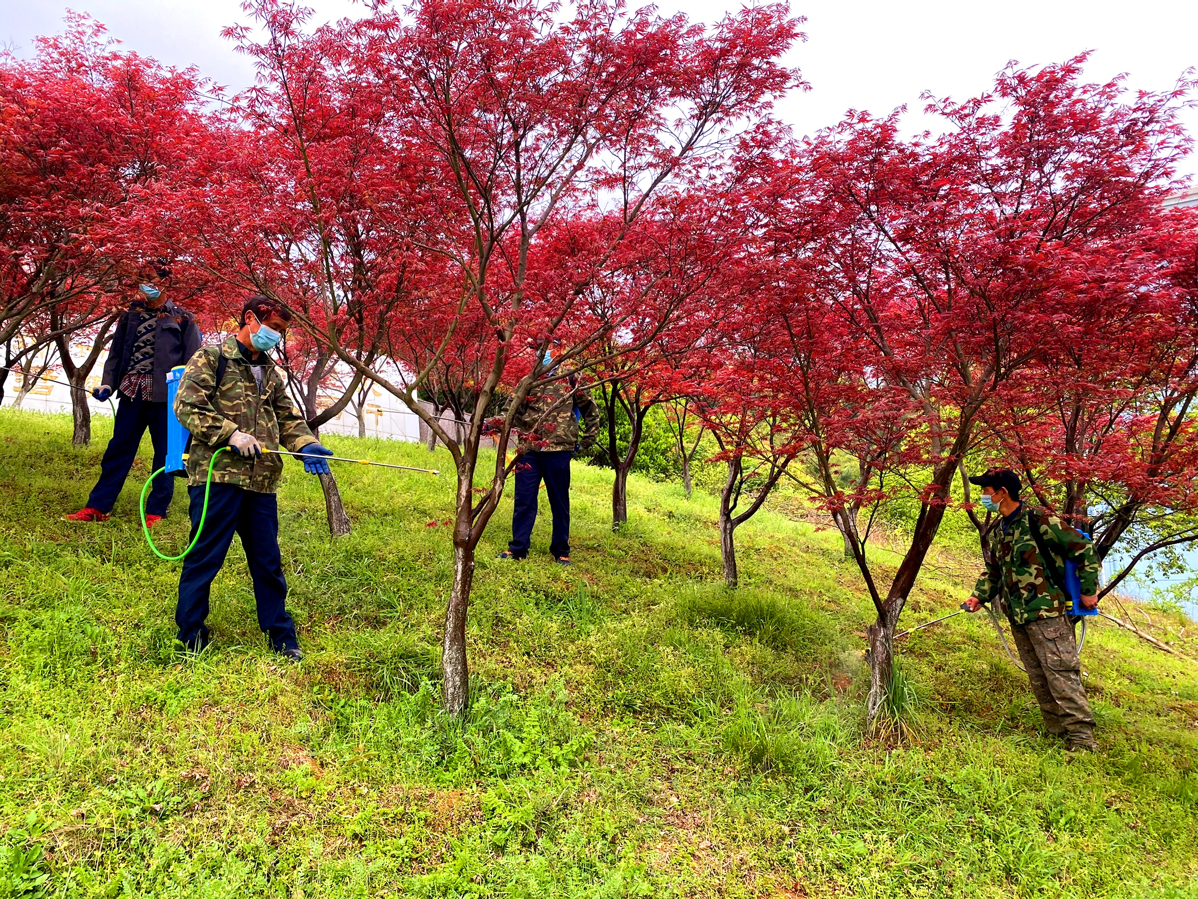 春季绿化养护工作以防治病虫害为重中之重,随着天气逐渐转暖,多种树木病虫害又相继开始活动。三月以来,武汉的阴雨天不断,但环艺师傅们仍冒着淅沥春雨,及时对校园红枫林进行了打药工作,减少了病虫害的发生几率,保证了红枫的春季长势。现在正是校园红枫长势的旺盛期,“勤仁坡”望去,一幅火红艳丽、勃勃春机的画卷,其中倾注了每一位环艺师傅们的辛勤培育和汗水。