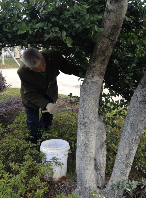 随着天气渐渐转冷,为提高树木抗御病虫害能力,促进树木健康生长,使树木能安全过冬。近日,环艺部抓紧时间对校内行道树及部分景观树进行刷白工作。