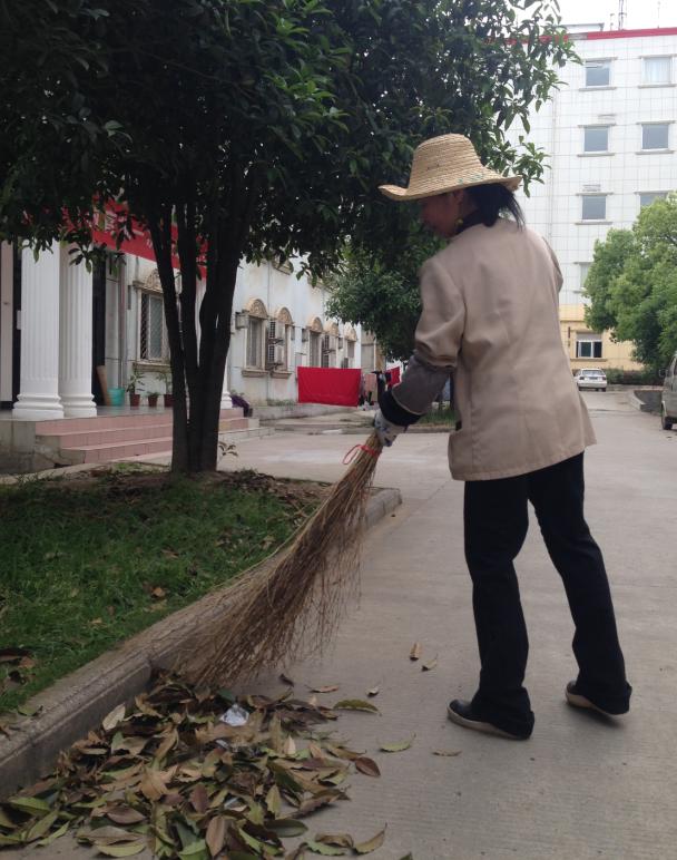 3月樟树落叶的季节,也是梅雨的季节。外围员工区域大,校园临近湖边,湖风较大,地上总是吹满了厚厚的落叶,前面扫后面落的,给保洁工作带来了很大的难度。为了保证地面的干净整洁,保洁员一天要不间断的清扫四次,这些落叶成了保洁员们每天的必修课。她们将落叶用扫帚扫成一堆,然后放到大的垃圾袋里,汗水已经浸汗了她们的衣裳,但她们全然不顾,仍在不停地扫着。随着时间的推移,保洁工的身边已经摆满了一袋袋的树叶,都是他们辛勤的汗水所至。